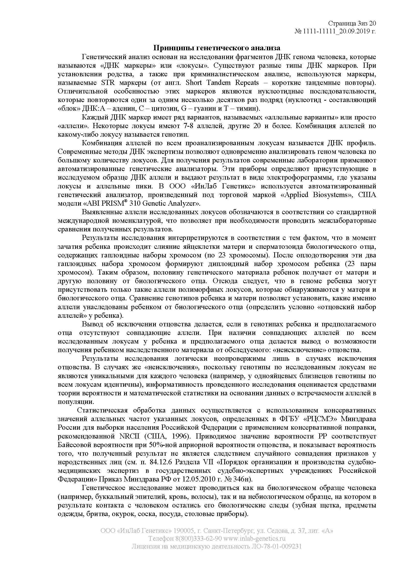 Мы проводим судебно-генетическую экспертизу на отцовство в строгом соответствии с законодательством РФ и соблюдением всех процессуальных нормативов. В результате экспертизы будет подготовлено исчерпывающее экспертное заключение. Это многостраничный прошитый документ, содержащий всю необходимую для суда информацию, который заверяется печатью лаборатории и подписью эксперта-генетика.